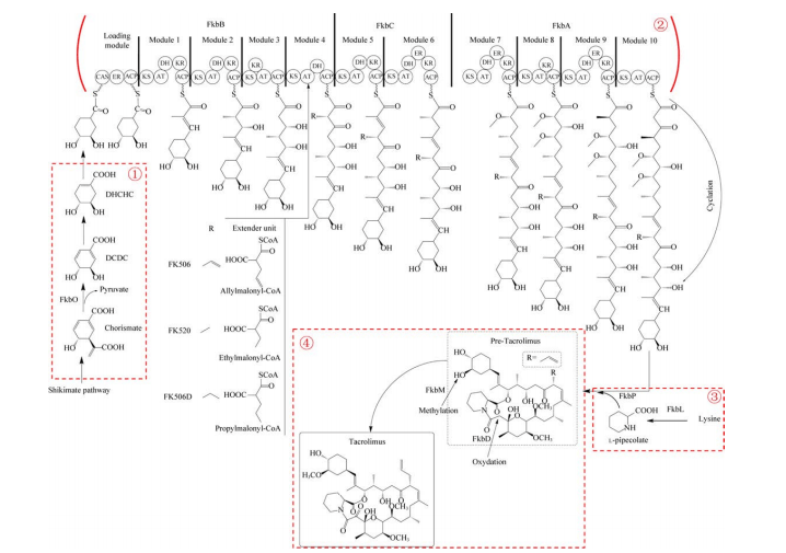 他克莫司的生物合成途径复杂,由筑波链霉菌的fkb基因簇编码的I型聚酮合酶-非核糖体肽合成酶杂合系统合成。生物合成过程可分为4个部分:起始单元生成、聚酮链延伸、内酯环形成和后修饰[4]。起始单元(4R,5R)-4,5-二羟基环己-1-烯羧酸来自莽草酸途径;聚酮链由聚酮合酶FkbA、FkbB和FkbC催化延伸,需要2个丙二酰-CoA、5个甲基丙二酰-CoA、2个甲氧基丙二酰-ACP和1个烯丙基丙二酰-CoA作为延伸单元;内酯环由L-赖氨酸衍生的L-哌啶酸与聚酮链缩合形成;最后经过FkbM催化的C31羟基甲基化和FkbD催化的C9氧化两步修饰形成他克莫司[5]。