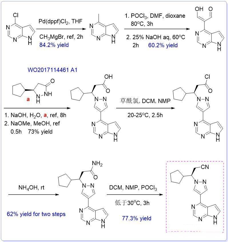 鲁索替尼的制备方法已有多种路线被报道,专利WO2017114461A1、WO2022040172A1、WO2022036030A1等文献中详细记录了不同合成策略。其中,以(E)-3-环戊基丙烯醛与4-溴-1H-吡唑为起始原料的合成路线因其反应步骤短、收率高而受到关注,适合工业化生产。文献DOI:10.1021/ol900350k也报道了相关合成方法,为化学合成研究提供了参考。这些制备方法的研究和优化,为鲁索替尼的大规模生产和质量提升奠定了基础。